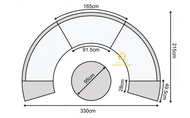 Kích thước băng dài: Đường kính 330 CM - Sâu 215 CM - Chiều cao 75 CM