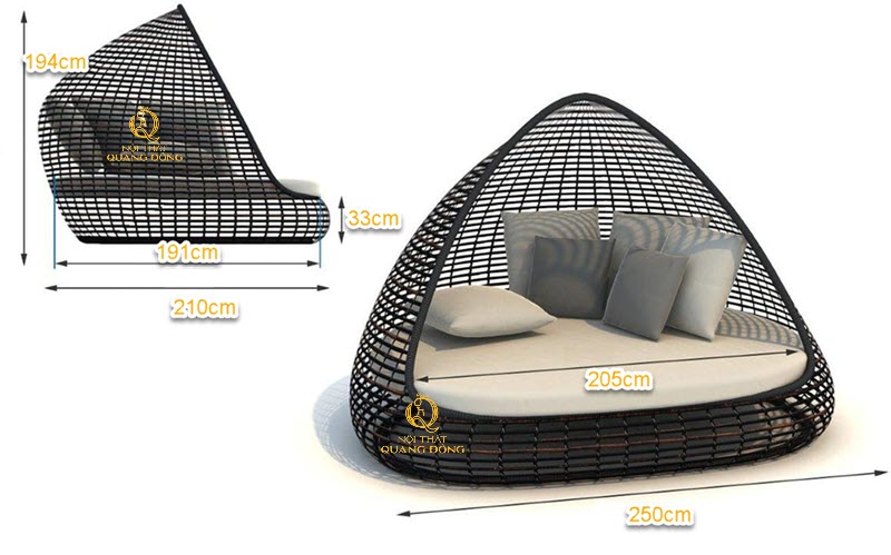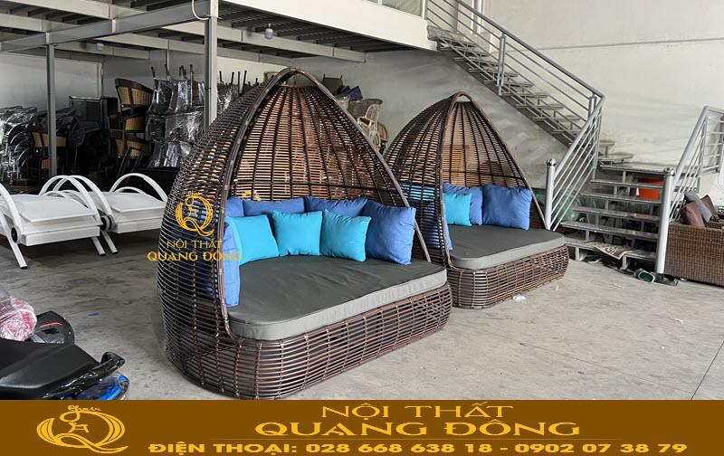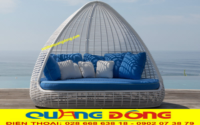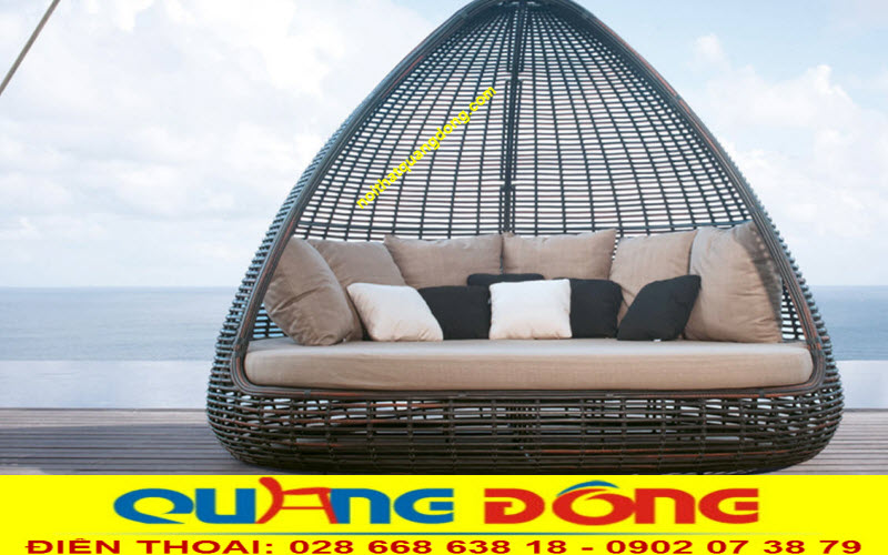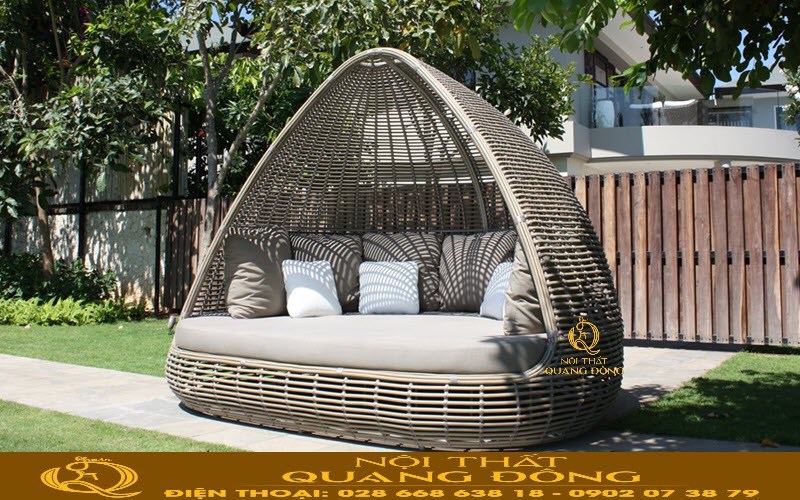 Mẫu giường tắm nắng mái vòm dạng hình chóp độc đáo từ ợi mây nhựa bán nguyệt bản lớn siêu bền