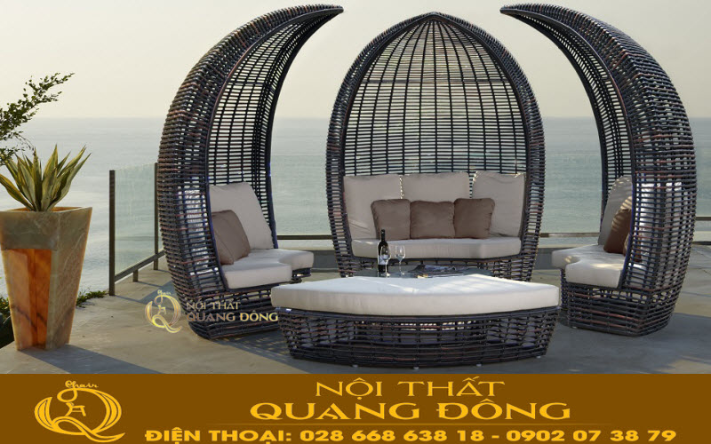 Thiết kế của bộ sofa giả mây QD-703 với 3 khối ghế rộng rãi, được set up cho từ 8-10 người ngồi, thích hợp là nơi lựa chọn pic nic, hoặc nghĩ dưỡng cùng gia đình, bạn bè. Mỗi khối ghế sofa được tạo hình theo dáng vòm đan từ chân ghế đến đỉnh mái che, để được một bộ sofa hoàn hảo như vậy, đòi hỏi tay nghề thợ đan thủ công phải vững chắc, kết cấu khung của sản phẩm phải được tính toán tỉ mỉ, và từ những người thợ cơ khí cứng nghề.